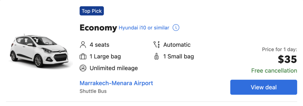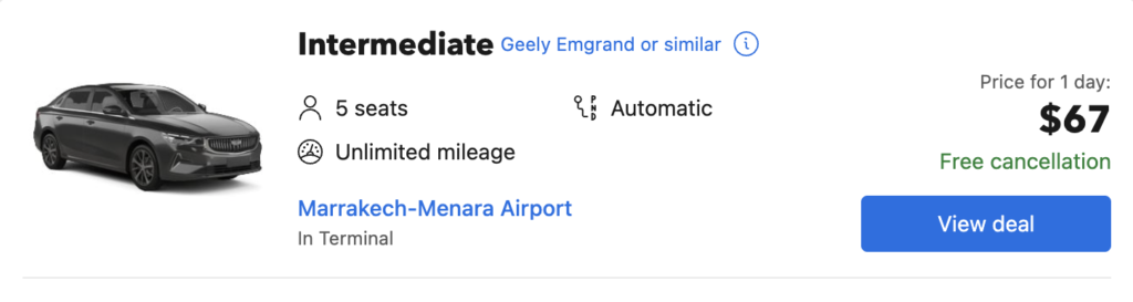 Car rental is widely available in major cities like Casablanca, Marrakech, Fes, and Agadir, as well as at airports. Both international brands and local agencies operate throughout the country.