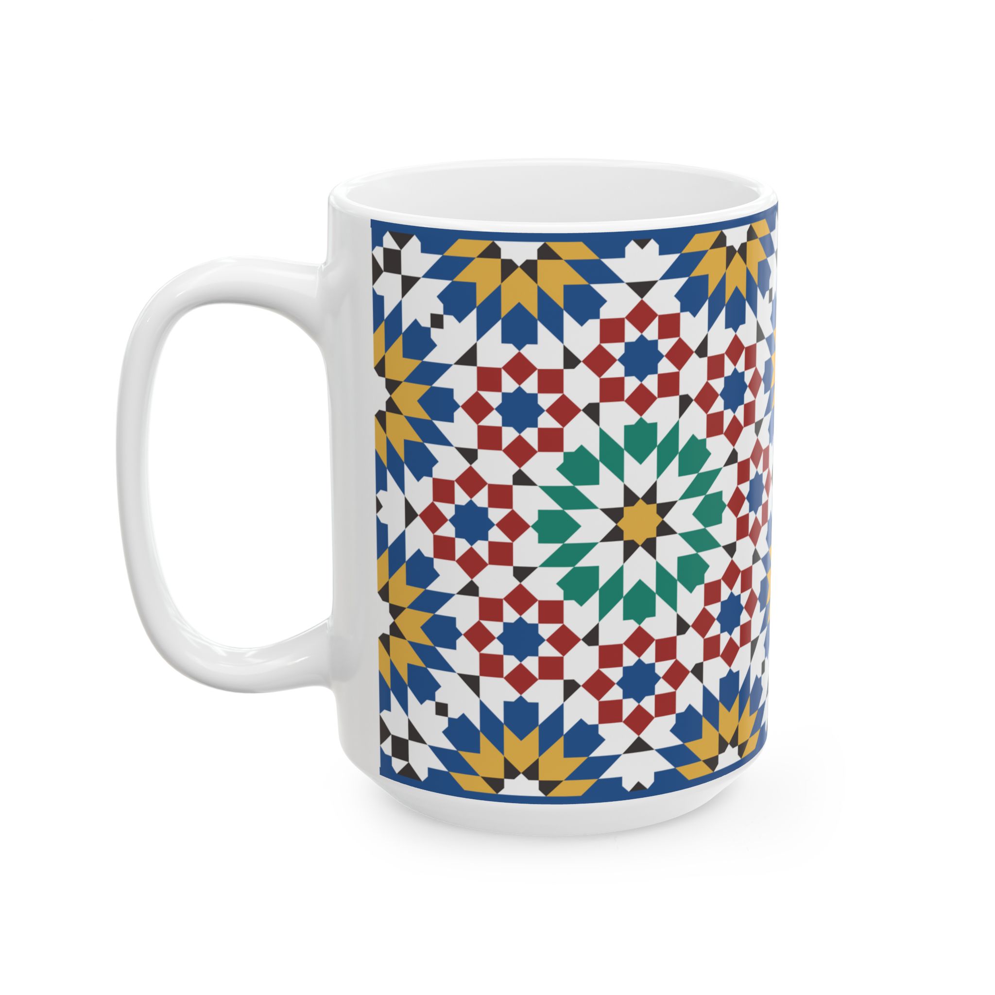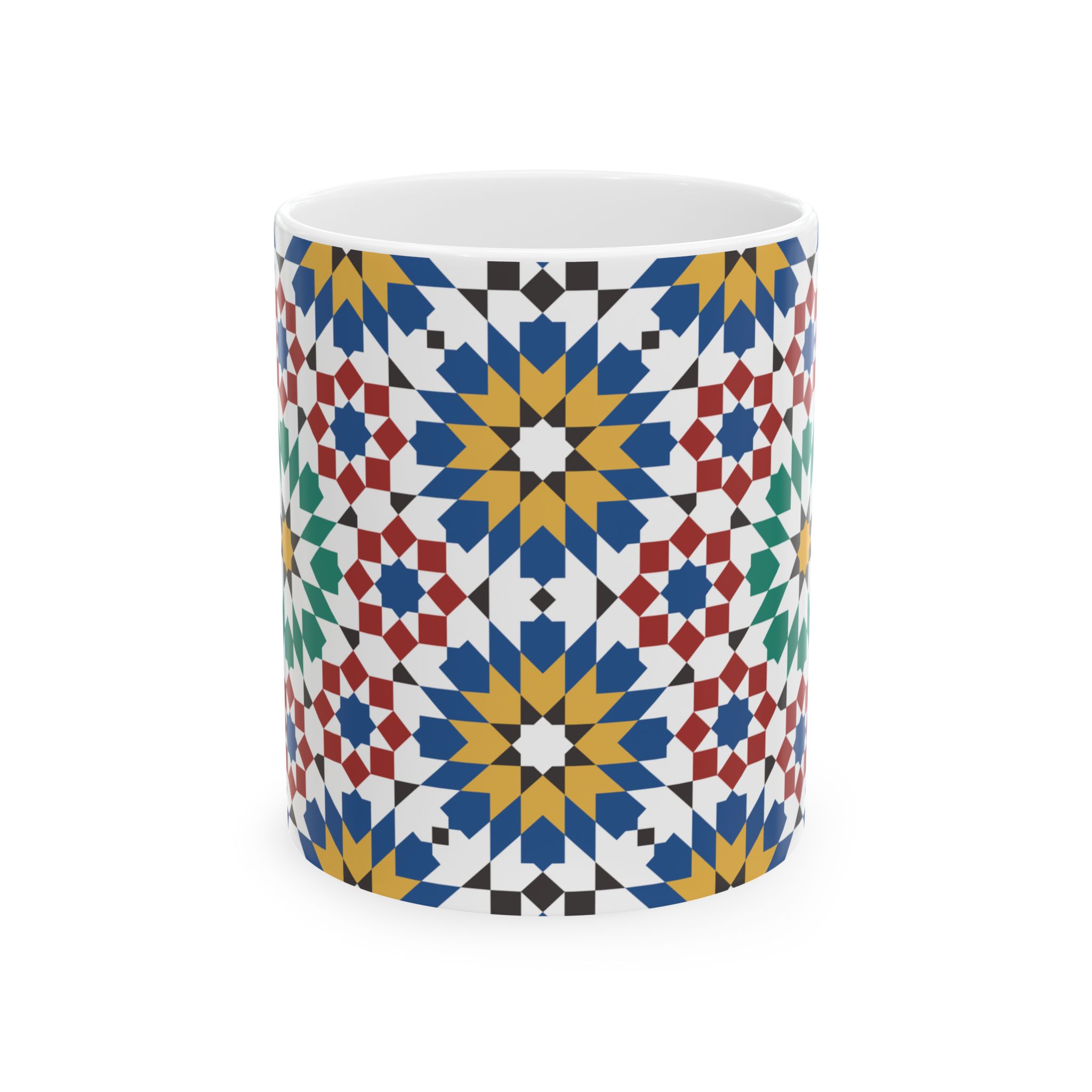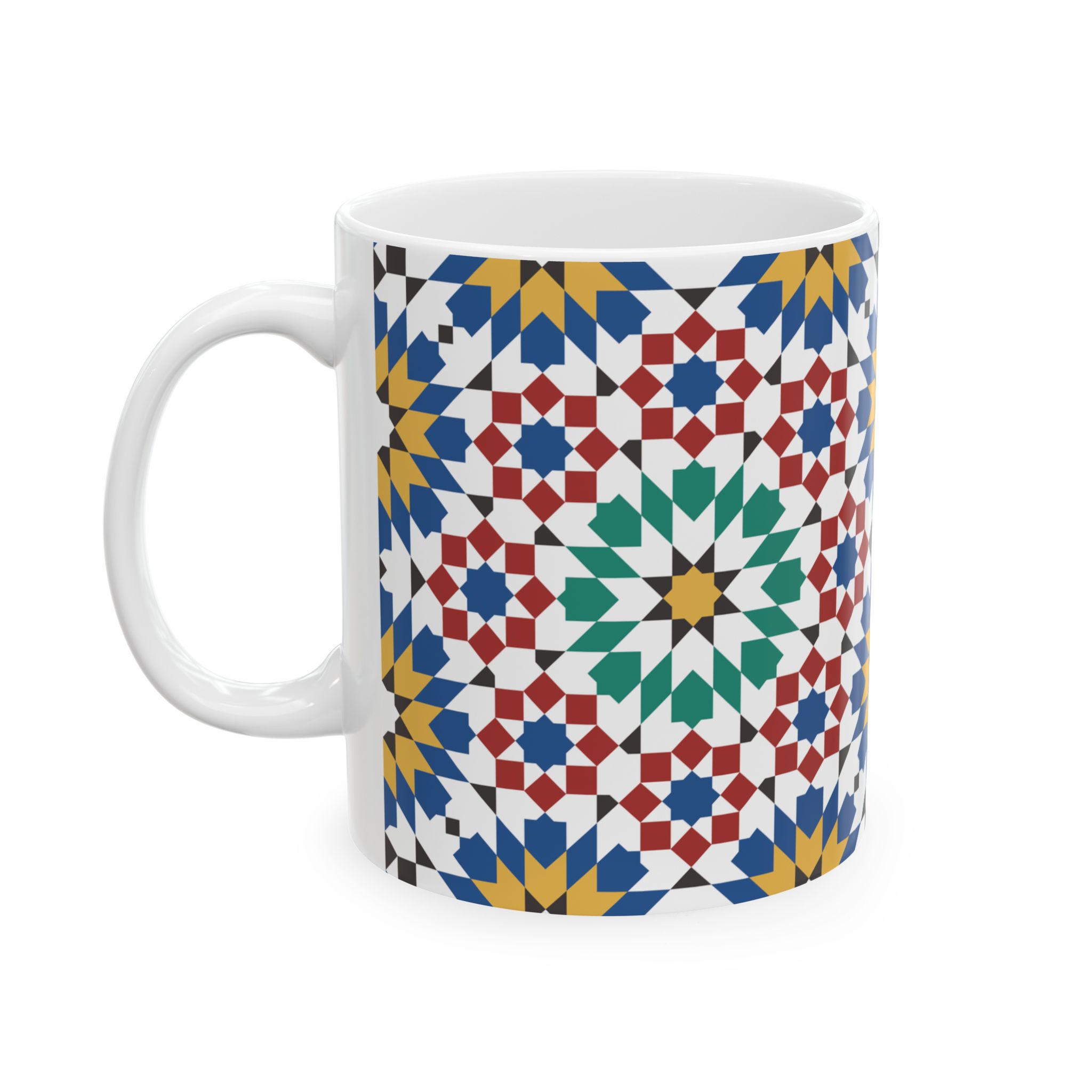 Bright, geometric tiles wrap this ceramic mug in a lively, mosaic pattern that brings color and rhythm to morning coffee or late-night tea. The repeating star-and-petal motif feels both timeless and modern — like a sunlit courtyard in a favorite travel memory. The glossy surface makes the colors pop and invites a second look, while the comfortable C-handle keeps each sip easy and relaxed. Use it on quiet weekday mornings, during creative studio sessions, or when you want a small, cheerful burst of pattern on your desk.