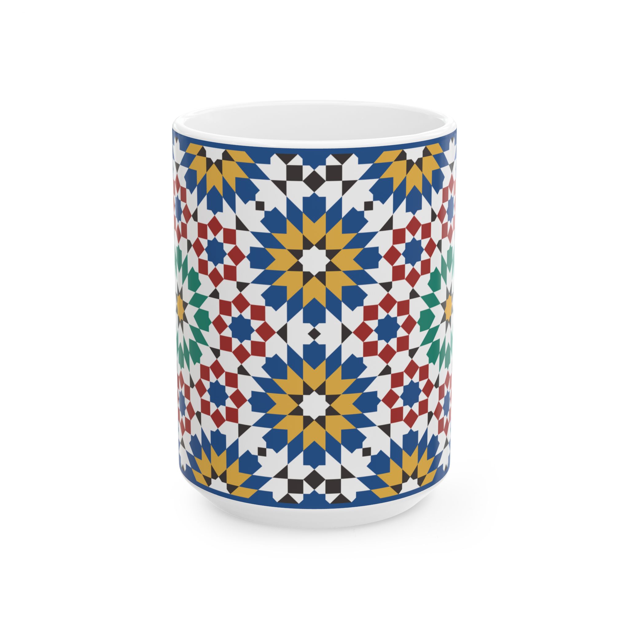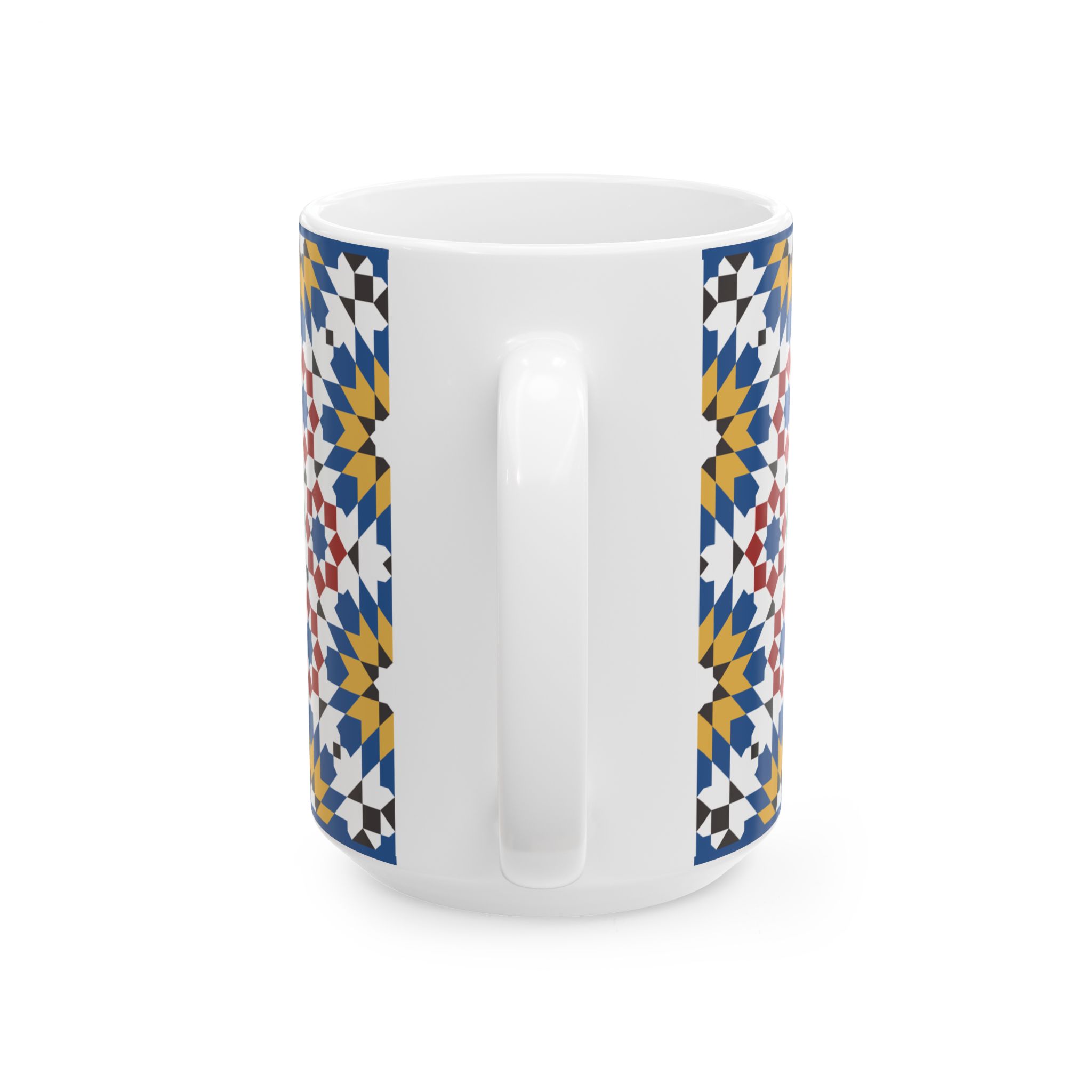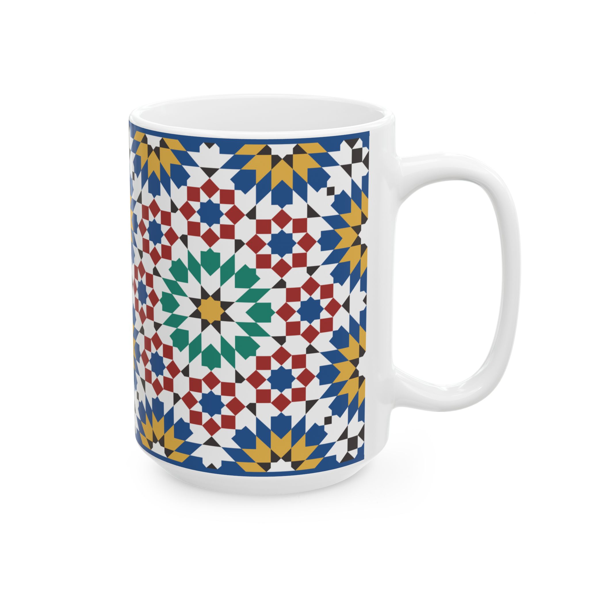 Bright, geometric tiles wrap this ceramic mug in a lively, mosaic pattern that brings color and rhythm to morning coffee or late-night tea. The repeating star-and-petal motif feels both timeless and modern — like a sunlit courtyard in a favorite travel memory. The glossy surface makes the colors pop and invites a second look, while the comfortable C-handle keeps each sip easy and relaxed. Use it on quiet weekday mornings, during creative studio sessions, or when you want a small, cheerful burst of pattern on your desk.